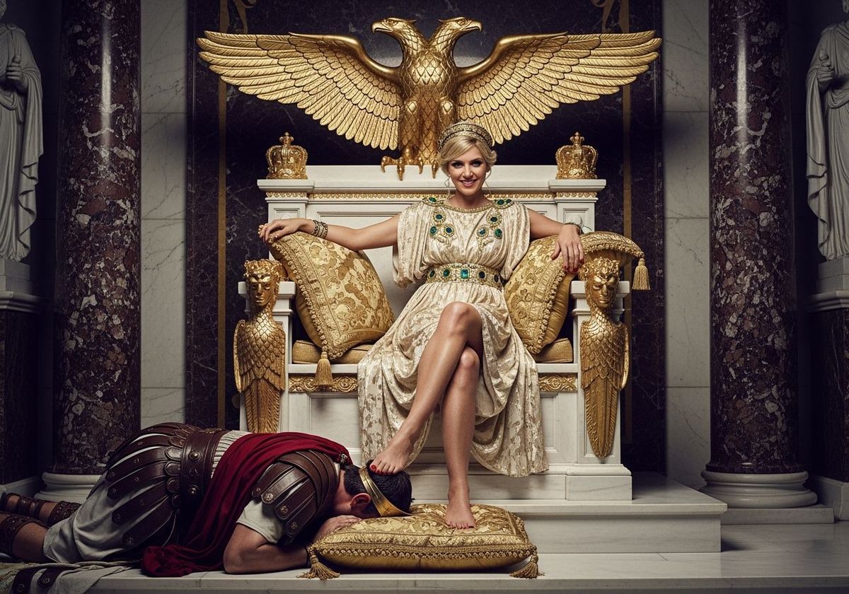 This image depicts Empress Messalina on a golden throne, stepping on a defeated king in a luxurious throne room. The photograph captures a cinematic, high-contrast scene with sharp focus and natural lighting.