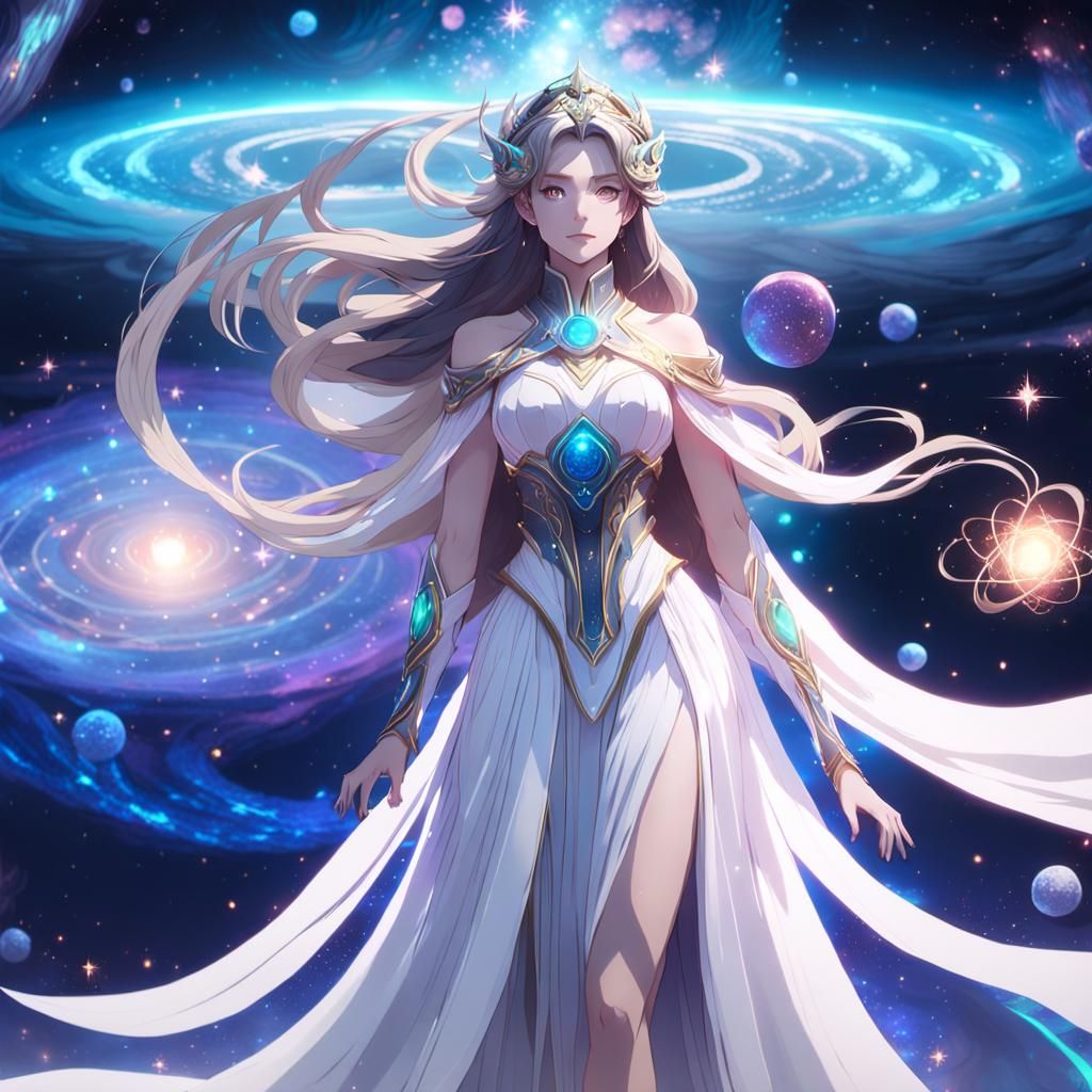 This image shows a celestial goddess surrounded by galaxies and nebulae. Her gown is illuminated by an ethereal aurora borealis and her hair interwoven with glowing constellations, in a vibrant anime aesthetic.