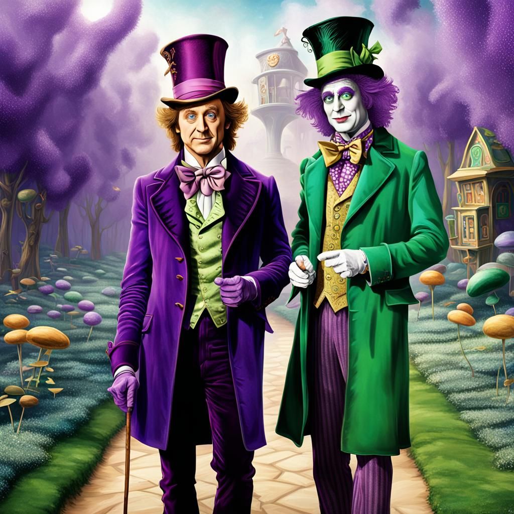 This image depicts Willy Wonka in purple and the Mad Hatter in green. The figures are whimsical and brightly colored.
