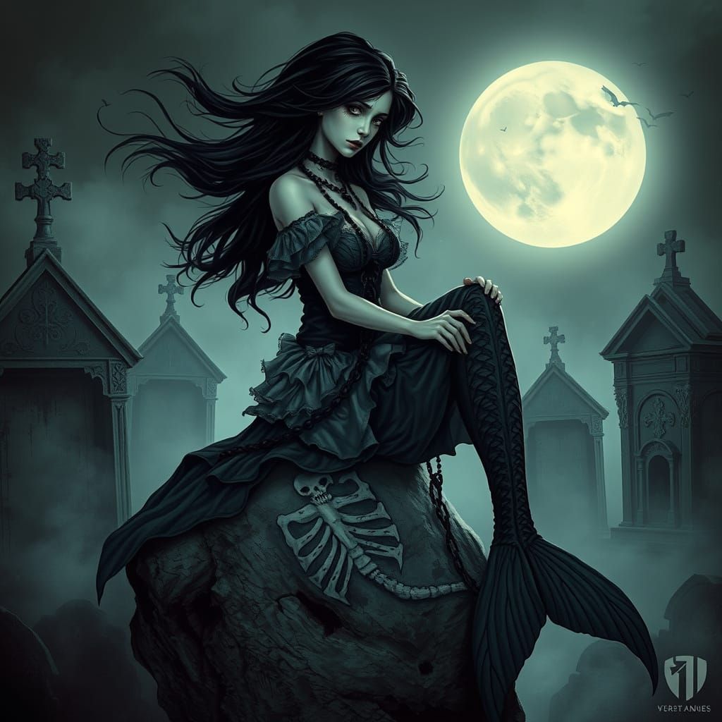 A sorrowful mermaid with long black hair sits on a rock in a graveyard, weeping black pearls. The image is rendered in a dark fantasy aesthetic with surreal and macabre elements.