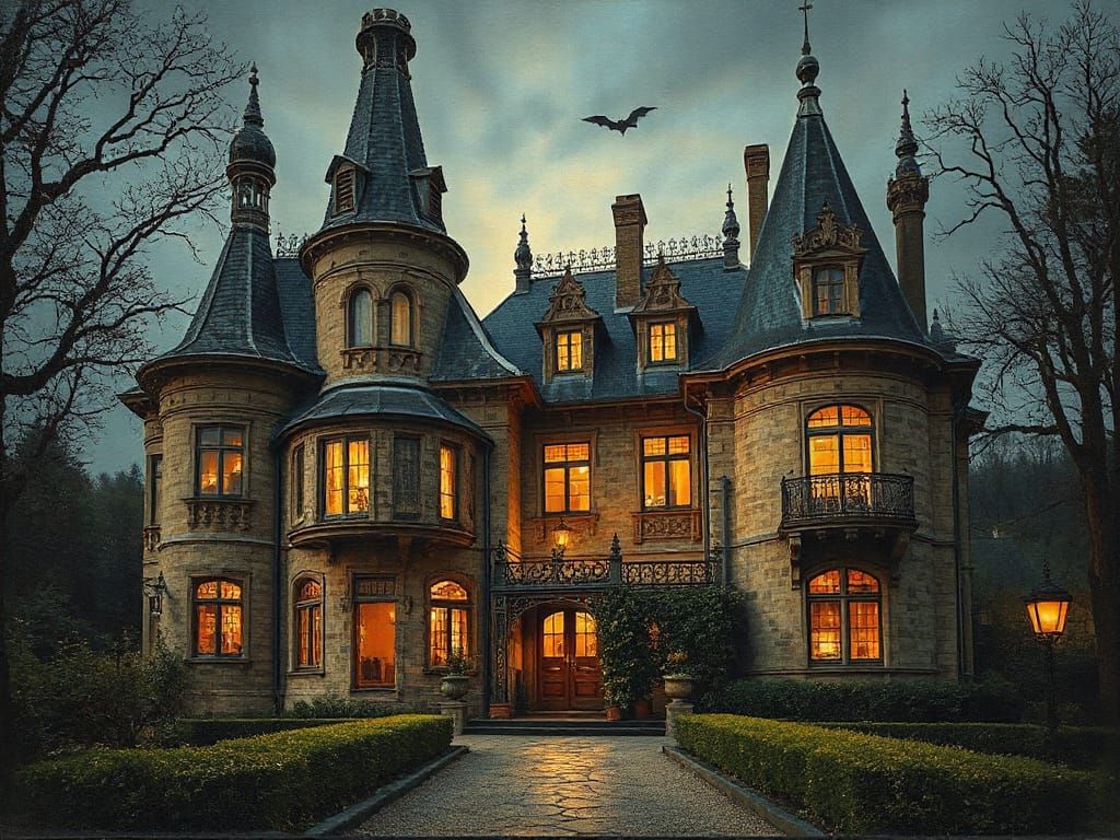 This image shows a realistic, brushed oil painting of a sinister Halloween house, likely Bourscheid Castle. It features vivid, shimmering colors and warm golden lighting, rendered with intricate, hyperrealistic detail.