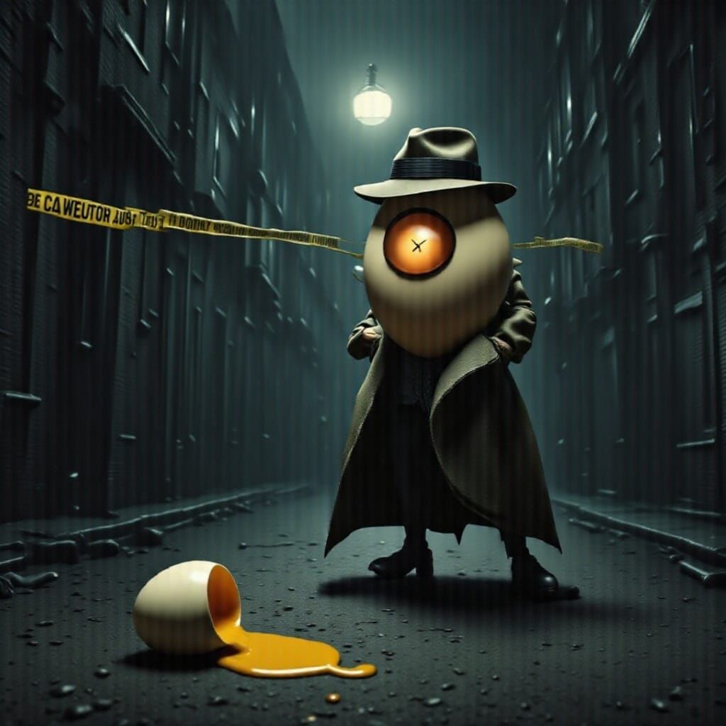 This image shows a film noir egg detective in a fedora and trench coat at a nighttime crime scene. Cinematic lighting and a gritty texture enhance the dramatic atmosphere.