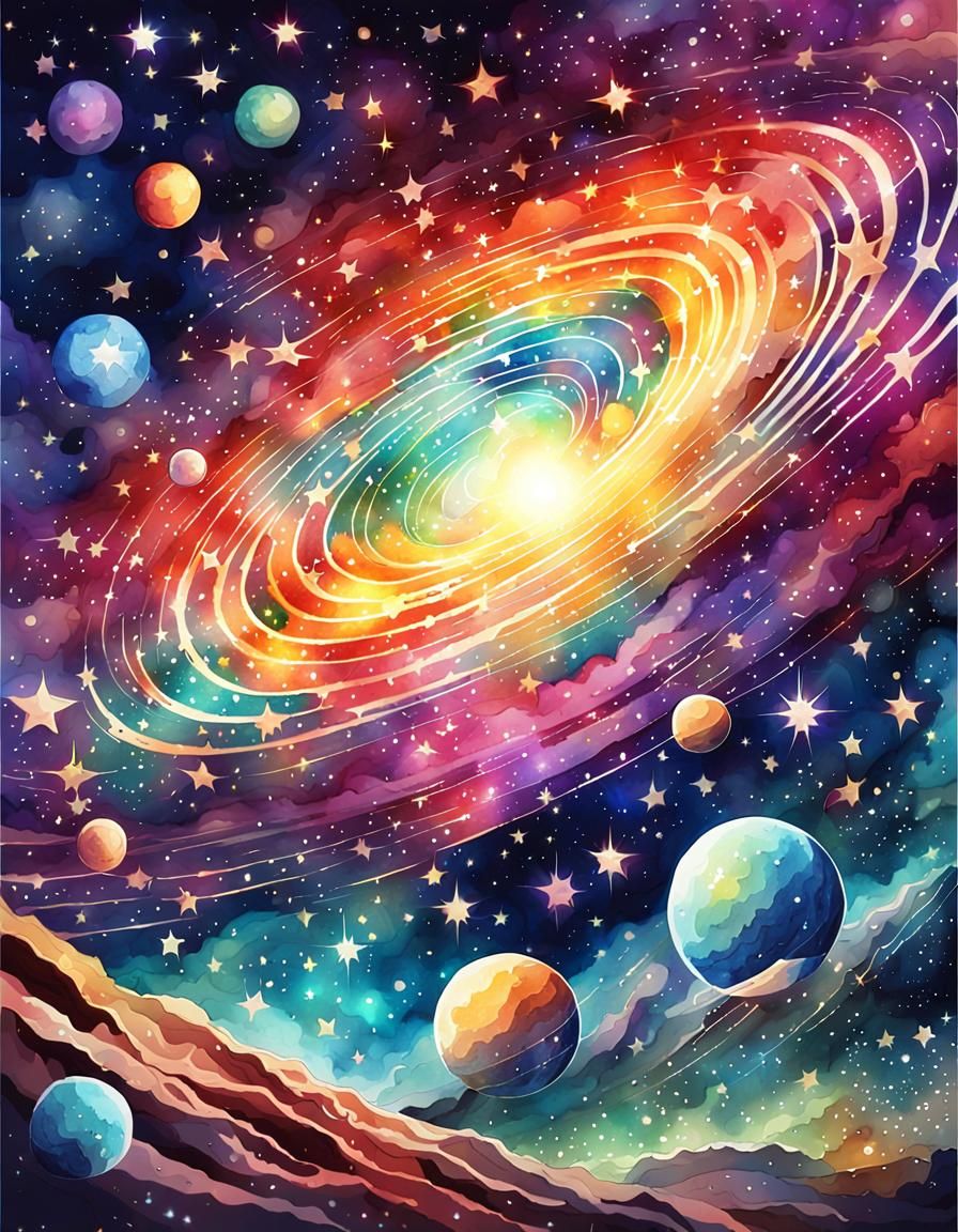 A vibrant, detailed image of a psychedelic cosmos filled with twinkling stars. The artwork evokes the style of a comic book cover, rendered as digital watercolor.