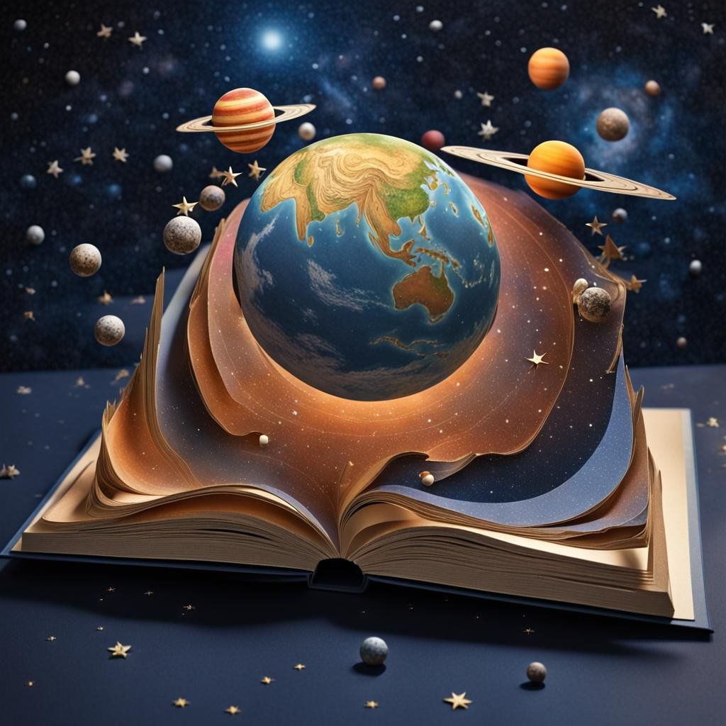 A digital illustration showing a pop-up book with detailed miniaturized planets, stars, and galaxies. The hyper-detailed scene depicts a meticulously composed little world in a galaxy space background.