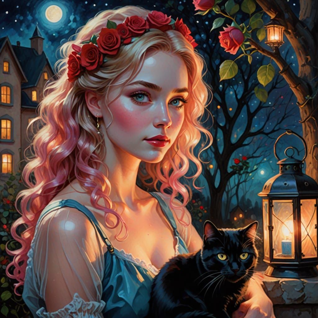 This airbrushed oil painting captures a sweet woman with blue eyes and pink-highlighted blond hair holding a red rose. The scene features a warm, dreamy atmosphere with soft focus and sparkling night lights.
