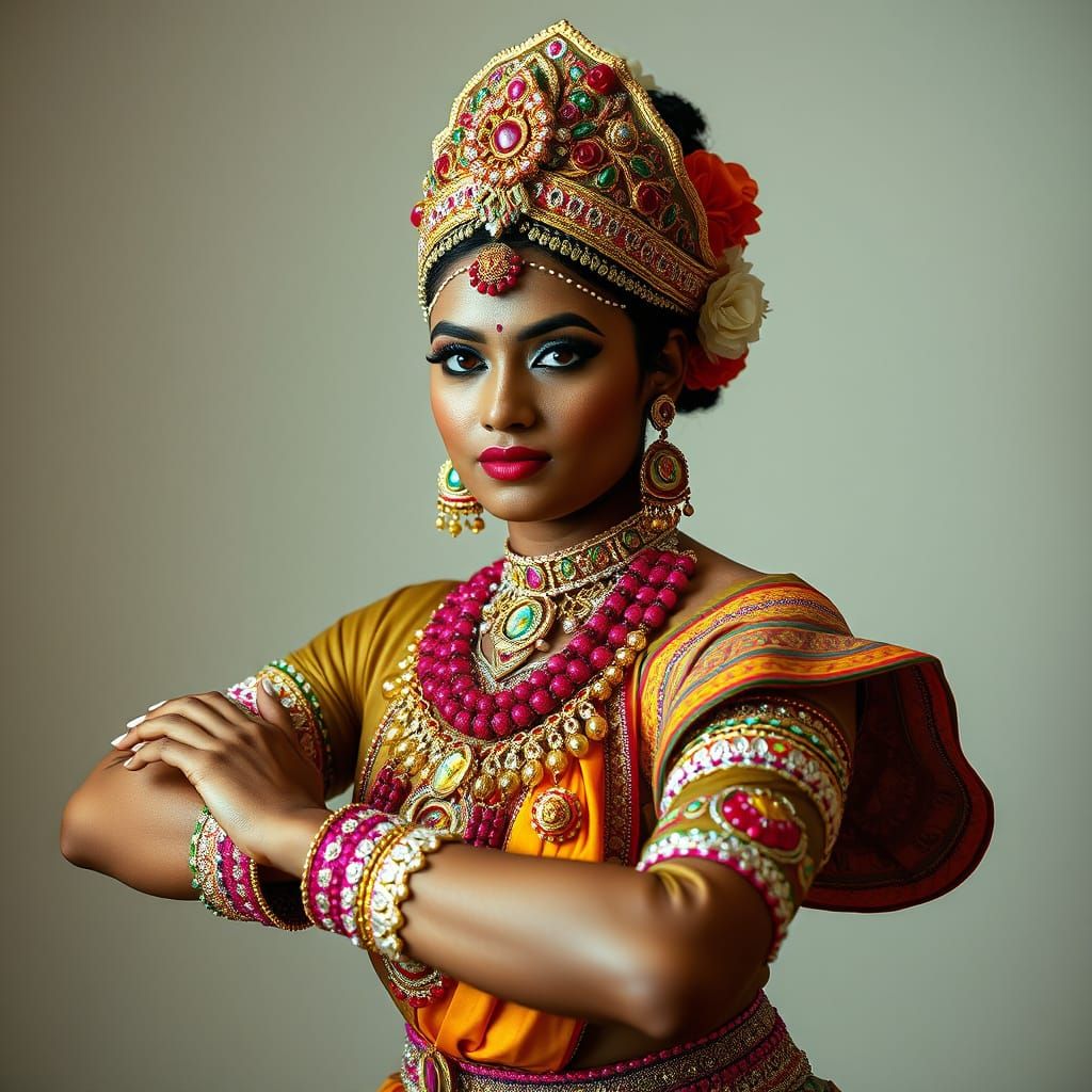 This image captures a traditional Sri Lankan Kandyan dancer in a stunning costume, adorned with vibrant colors and ornate accessories, in a photorealistic studio setting with soft natural lighting, blending the elegance of fine portraiture with the vibrant colors of a cultural heritage.