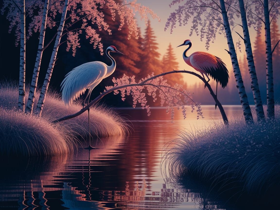 This impasto oil painting features contrasting ice and fire cranes on a cherry blossom tree. Peaceful birch trees and water reflections create a tranquil, elegant scene with textured, expressionist strokes.