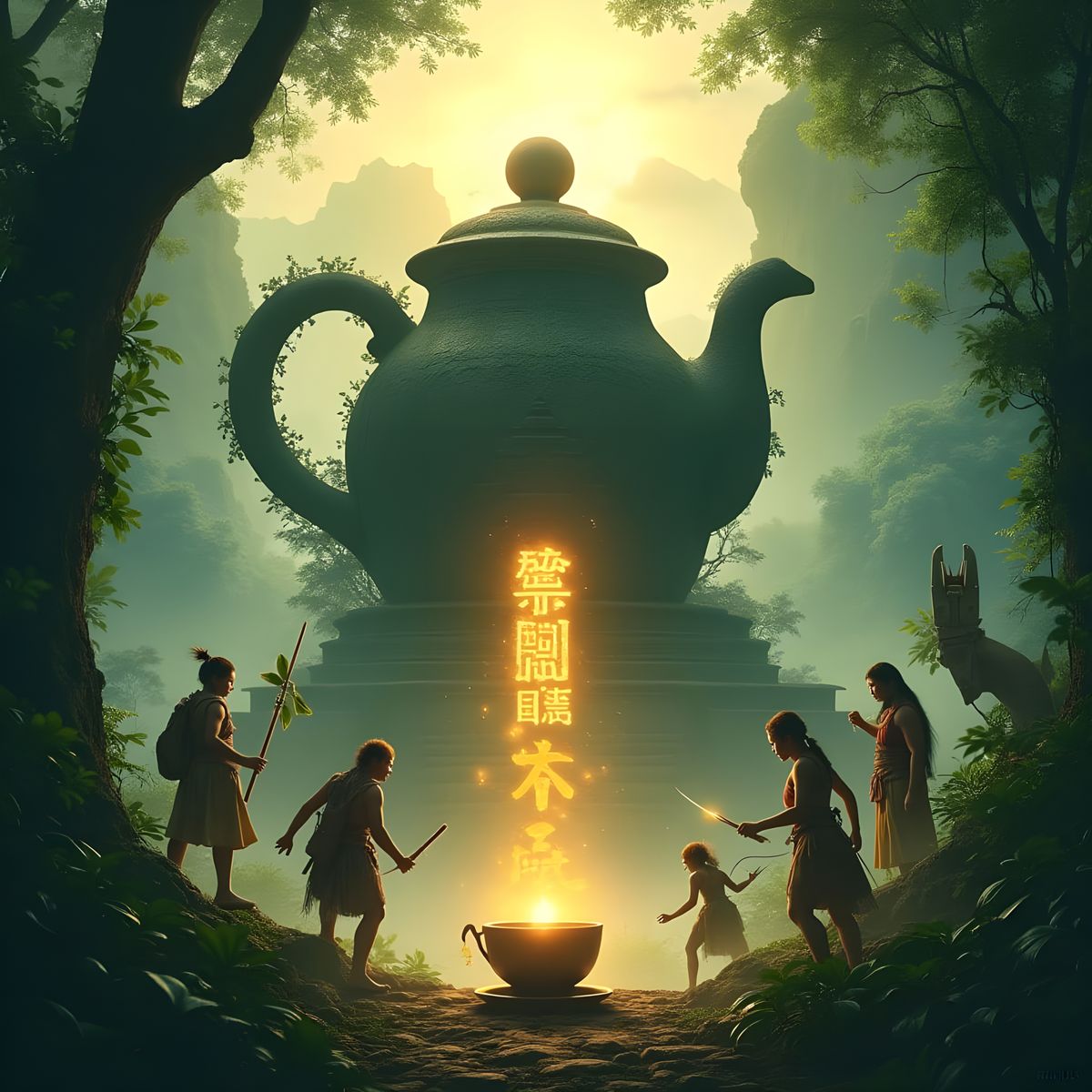 This cinematic poster depicts a mystical Asian jungle adventure scene with ancient ruins, misty mountains, and golden sunlight. A massive temple stands center, surrounded by adventurers and tribal guardians, with mythical creatures emerging from the mist.