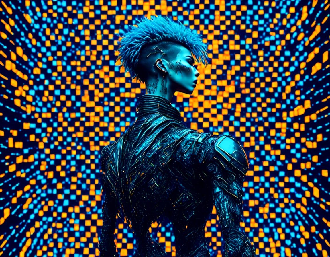 A striking picture of a cybernetic male with blue hair and a biohazard tattoo, building a futuristic motorcycle. The character is rendered in a colorful cyberpunk aesthetic.