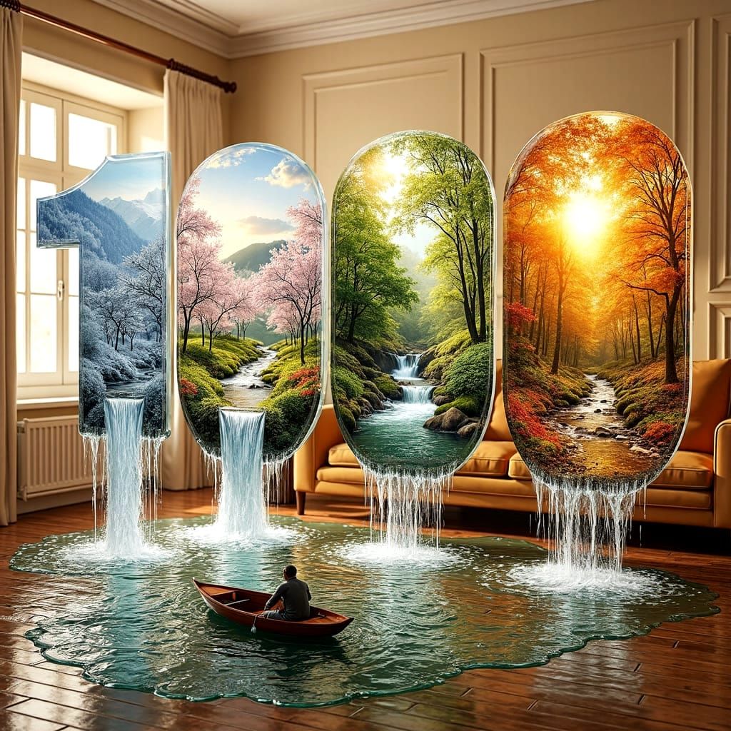 Evolved from an image made in GPT1 Medium. I think this is the first time I've tried an "all four seasons in one picture" creation, and I'm reasonably certain that the ridiculous prompt I used is also the longest prompt I've ever used.
