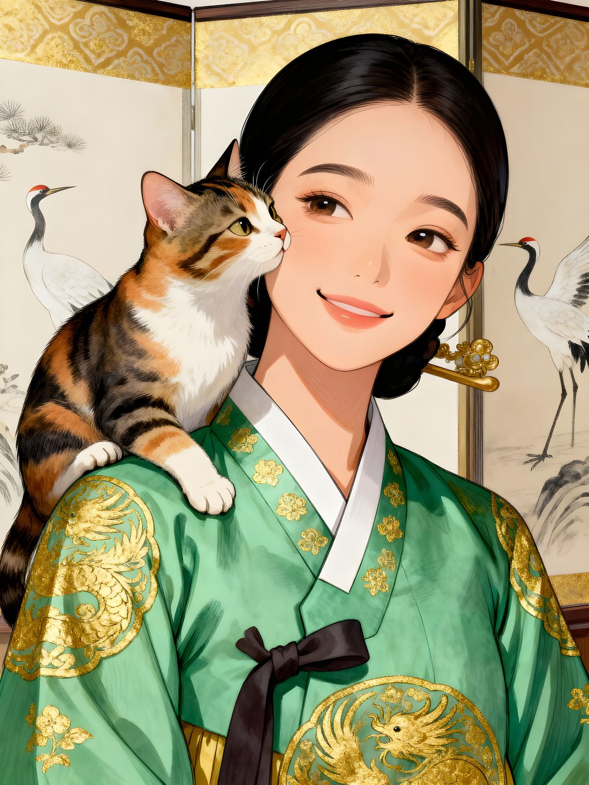 This manhwa-style drawing features an elegant woman in a jade-green hanbok, with a calico cat nuzzling her cheek. The image uses detailed pencil shading and a serene, warm aesthetic.