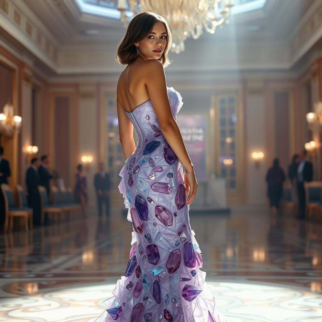 This image showcases a woman in a stunning, crystalline mermaid dress, surrounded by grand ballroom opulence, with precise, hyperrealistic details and a cinematic atmosphere.