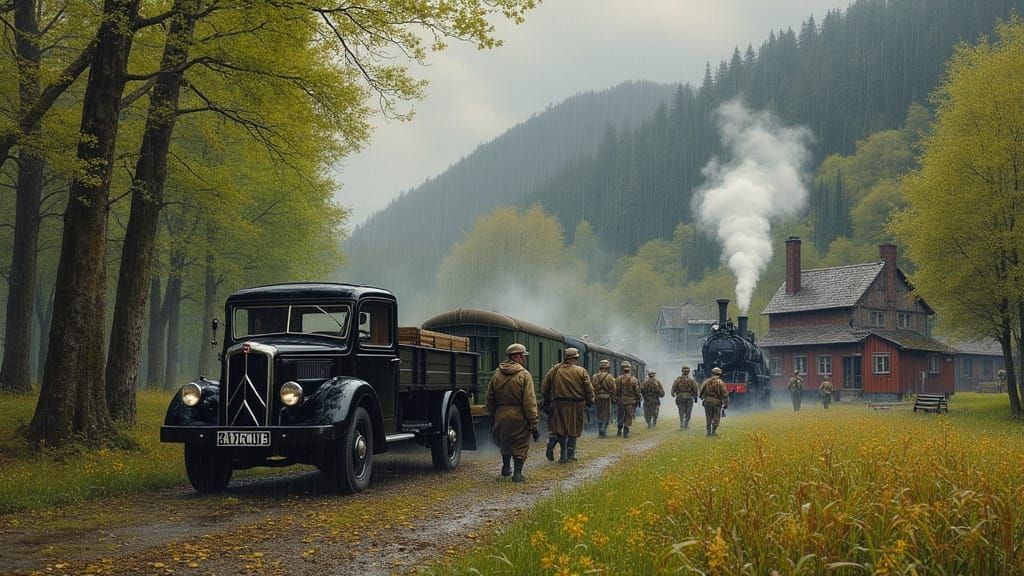 This image shows French resistance fighters walking through a rainy, verdant forest in the 1940s. A vintage black Citroen car is parked nearby, with a quaint French village visible in the distance, rendered as a realistic oil painting.