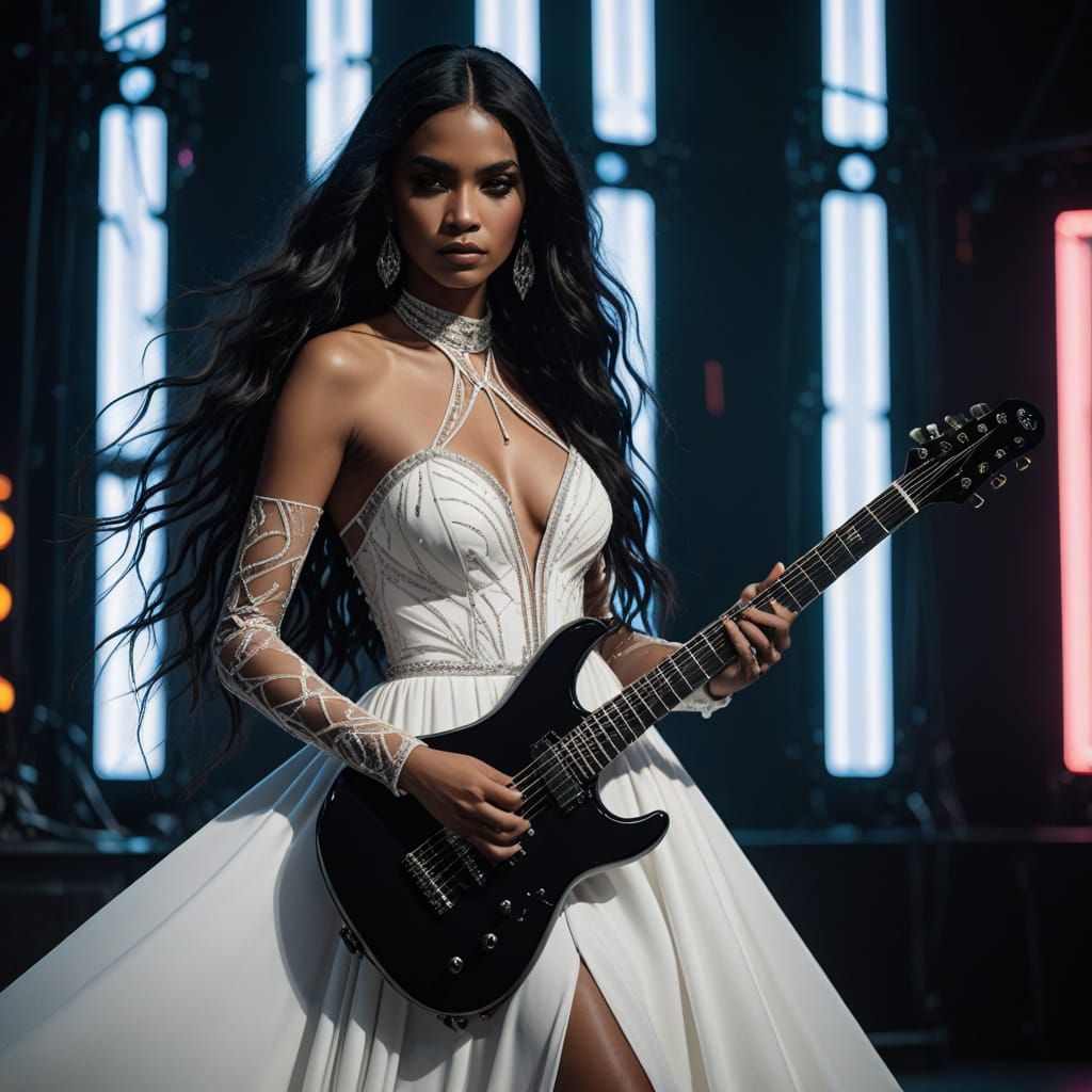 This image shows a Dominican woman with long black hair and gray eyes on a neon-lit stage. She holds an electric guitar, wearing a white gothic gown with silver chains, in a high-fashion editorial style.