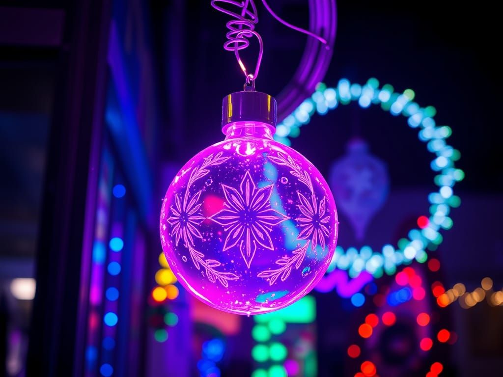 This image showcases a vibrant, high-contrast Christmas light decoration glowing at night. It features a synthwave neon aesthetic with spray paint textures and polychromatic details.