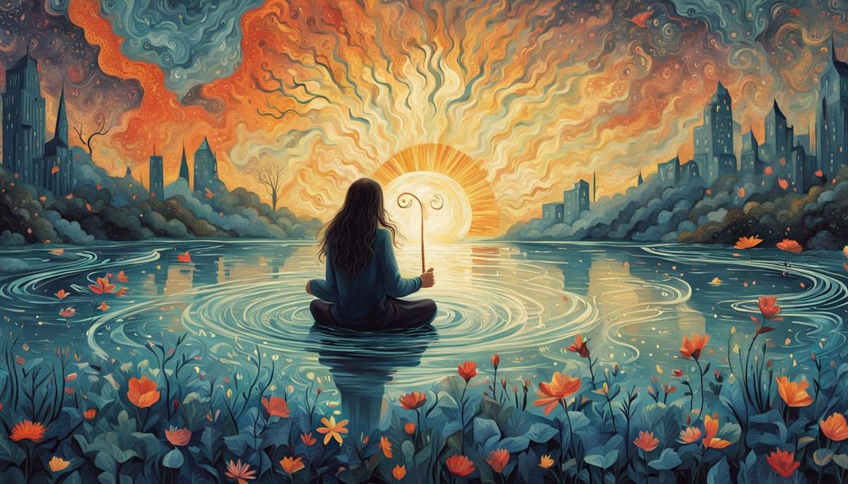 This image depicts a mystical woman surrounded by lush patterns and mythical creatures, with a vibrant fantasy plant kingdom in the background, illuminated by soft ethereal light.