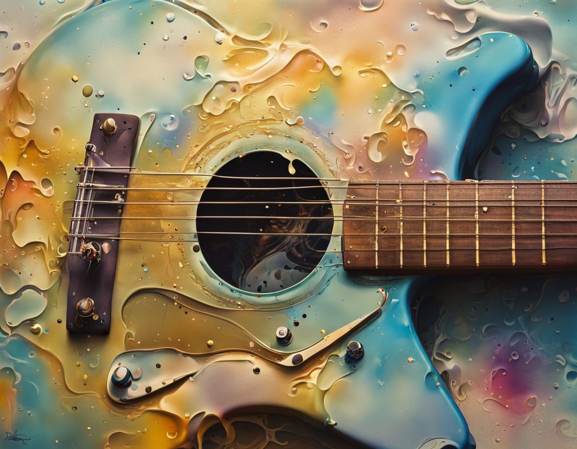 A surreal image of an airbrushed guitar in the Dadaism style. The artwork features dreamlike textures, vibrant splatters and warm lighting, with an abstract and expressive aesthetic.
