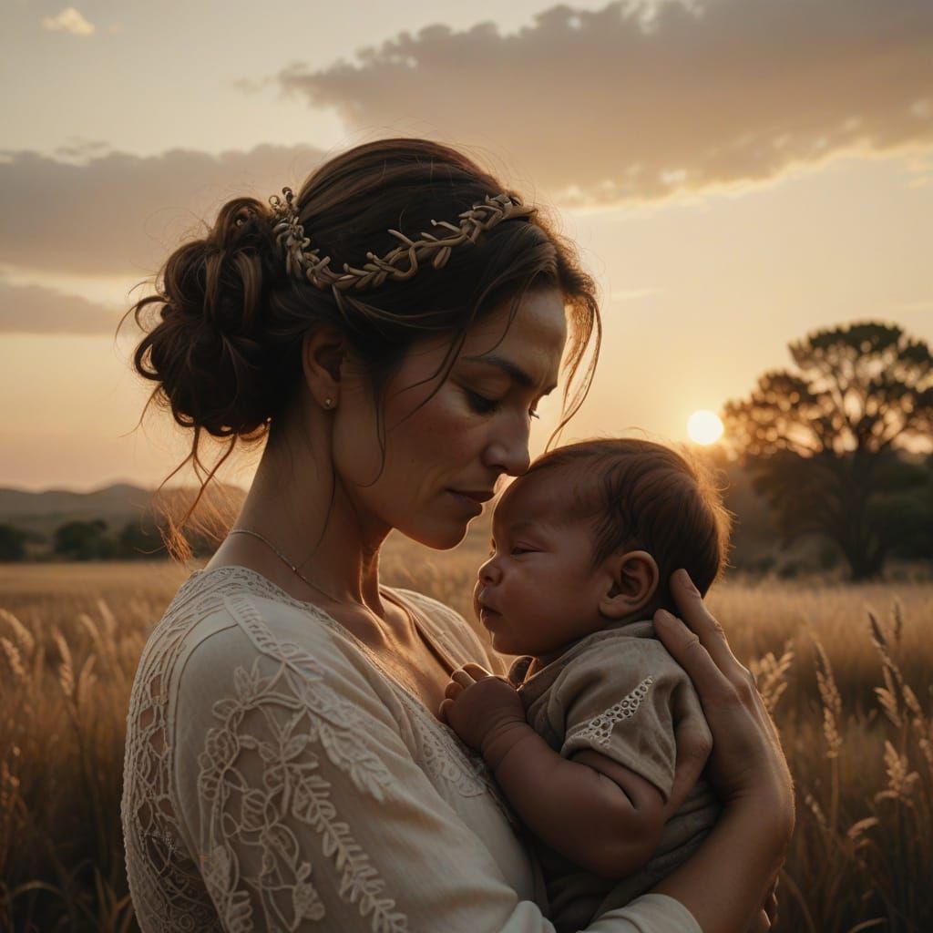 This image captures a heartwarming moment of a mother embracing her newborn, set against a warm, golden sunset backdrop. Shot in high-contrast black and white with subtle film grain, the tender scene is bathed in a soft, serene light.