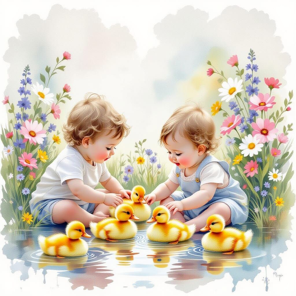 This ethereal watercolour and ink macro image features a baby brother and sister joyfully interacting with ducklings, surrounded by soft flowers. The background is splotchy with white spaces.