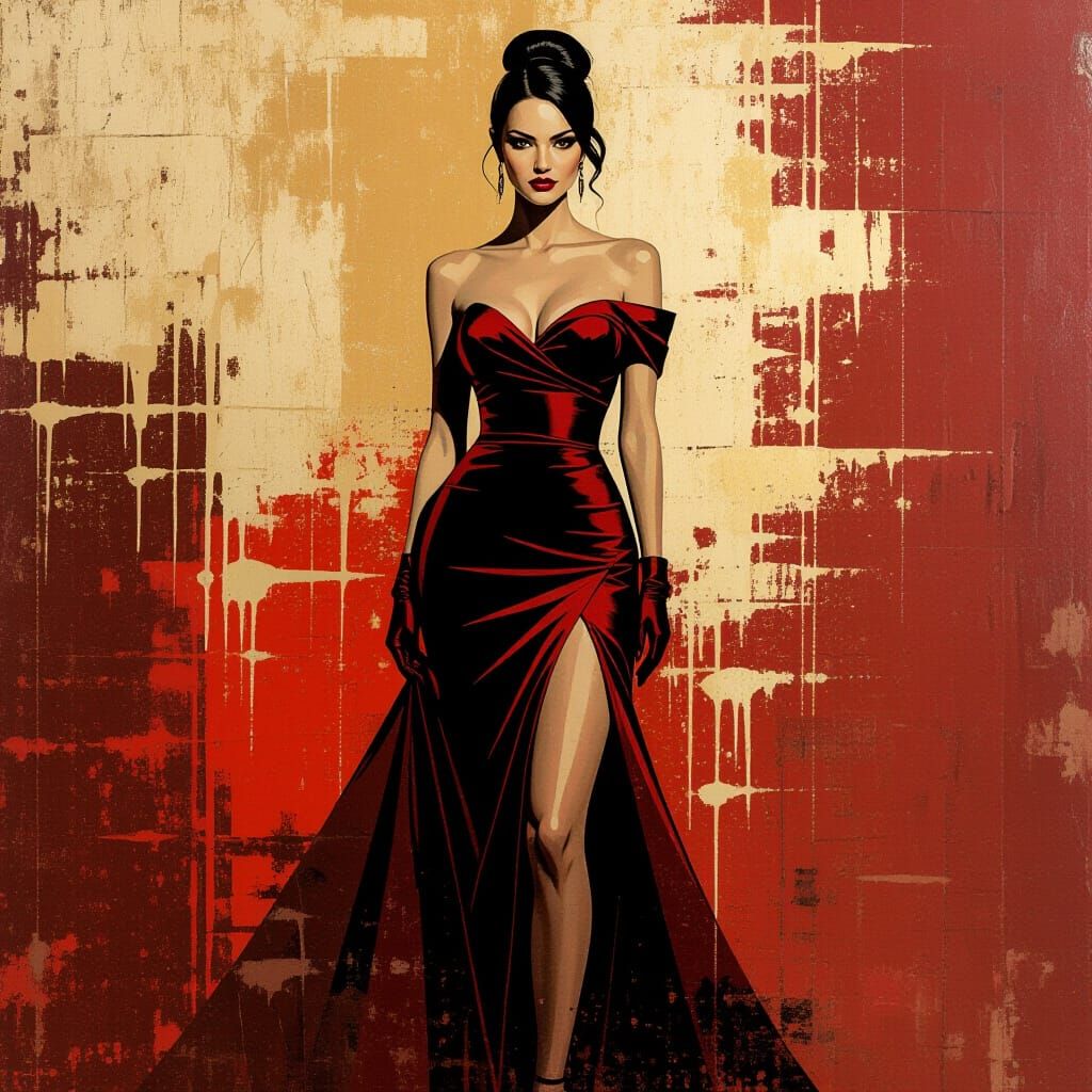 This image shows a beautiful woman in elegant attire, set against a vibrant and colorful mixed media backdrop. The artwork features abstract textures and expressive brushstrokes, in a mixed media style.