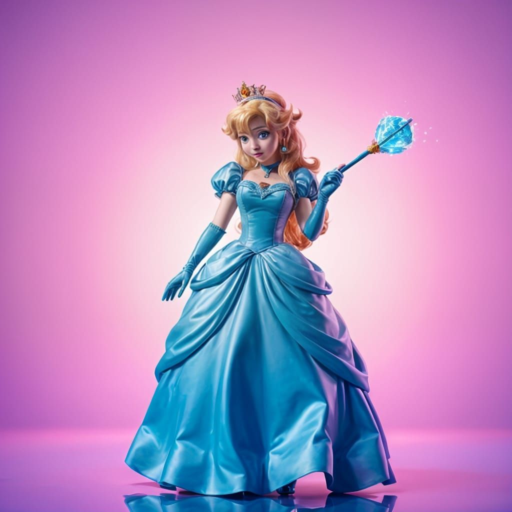 This image shows Princess Peach in a blue gown, holding a wand. The digital art features sparkling accents, golden hour lighting and volumetric effects in a bright, vibrant color palette.