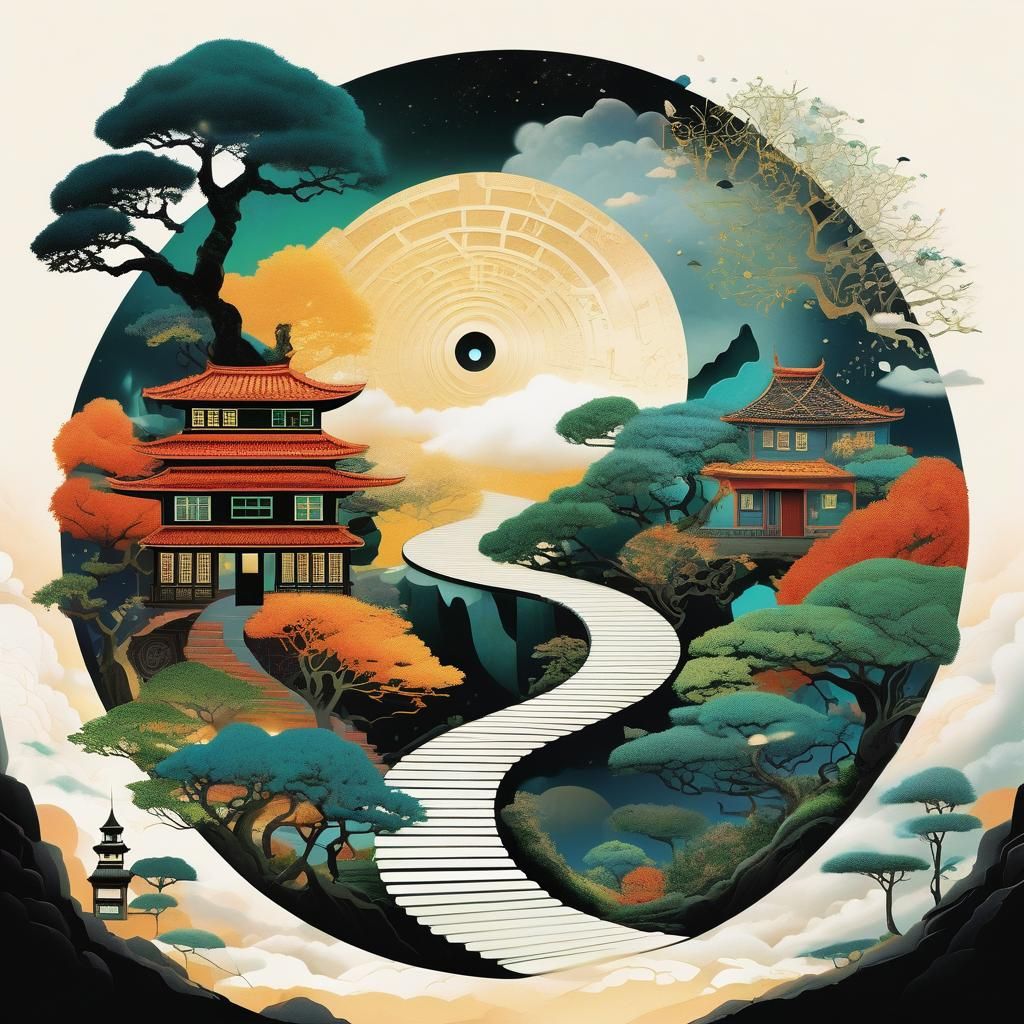 A striking picture of a fantasy stargate adorned with bonsai and cottages, leading to a dreamlike cloudscape. The image is a surreal collage with anime and silhouette art elements.
