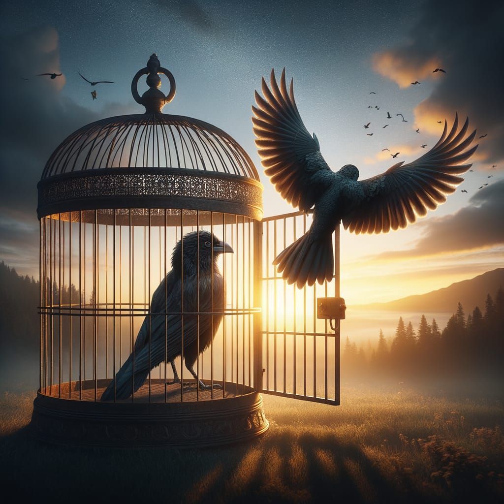 This image shows a beautiful black bird sitting inside an open cage, choosing safety over freedom. The scene is set against a backdrop of a splendid landscape and open sky, using strong contrasts in lighting.