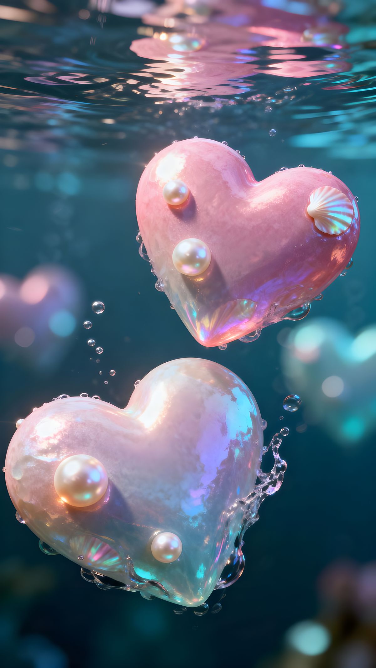 A hyperrealistic image of pastel hearts submerged in water, featuring intricate details, splash art style, and dramatic lighting.