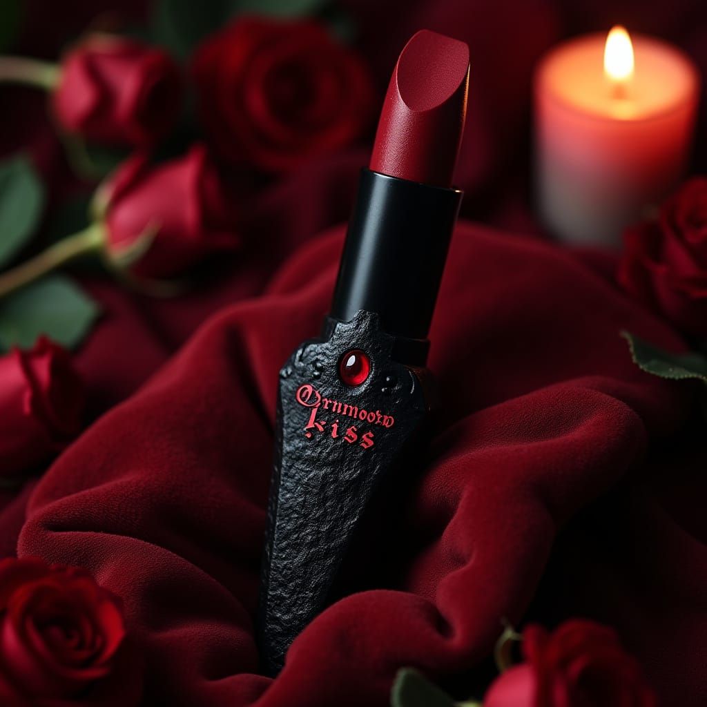 A dark fantasy lipstick called Crimson Kiss - Vampire's Seduction. The lipstick case is a black obsidian dagger with ruby accents. The label, engraved in ancient vampire script, reads "Irresistible Charm - One Kiss, Eternal Devotion."