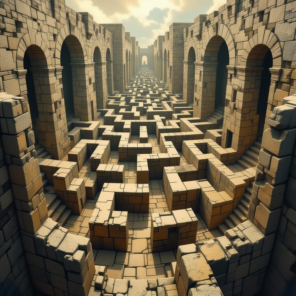 A surreal, intricate stone maze with winding paths and tall walls. The image features muted earthy tones and atmospheric lighting, reminiscent of dreamlike surrealist and fantastical art.