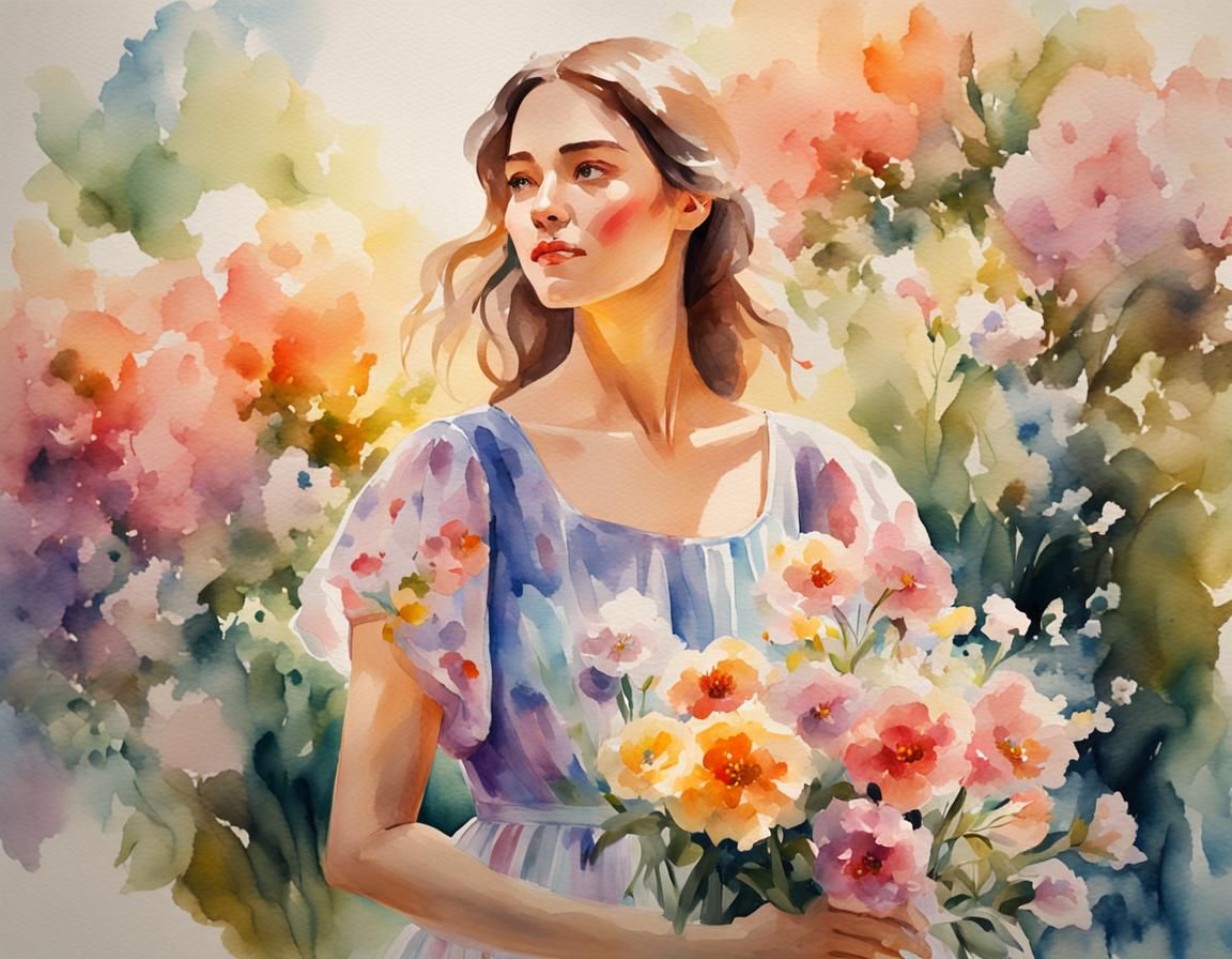 A vibrant watercolor painting of a woman in a flowing dress holding flowers in a blooming garden. The artwork uses soft brushstrokes and pastel shades to create a dreamy, romantic, and idyllic scene.