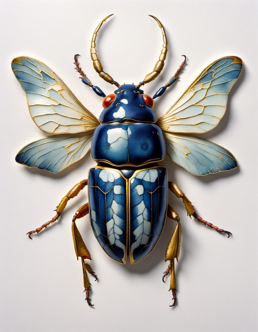 A surreal image of a porcelain beetle with watercolor wings repaired using kintsugi. The artwork evokes fantasy themes with a delicate, ethereal aesthetic.