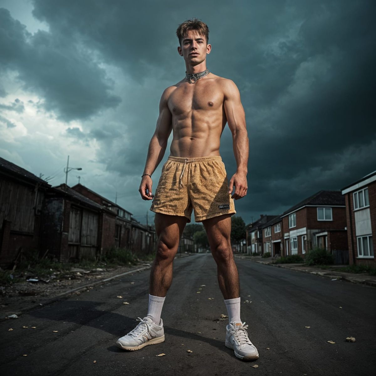 This image shows a muscular man standing defiantly in an urban environment. The hyperrealistic, full-body shot captures the raw energy of the subject with dramatic lighting and intense detail.