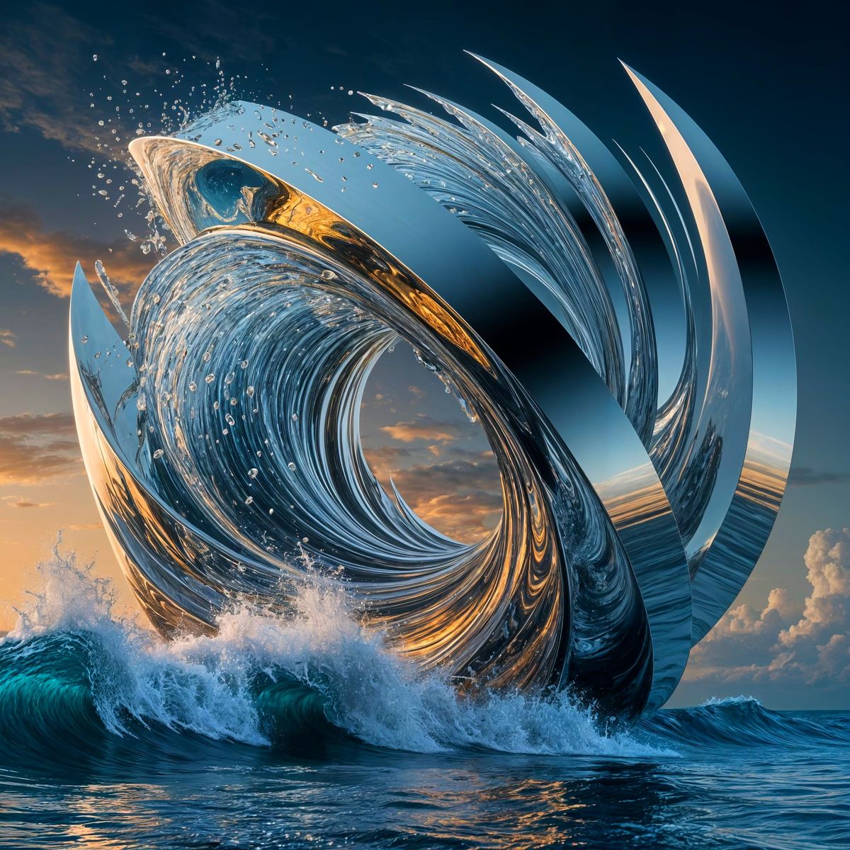 This digital art sculpture masterfully blends organic curves with geometric angles, combining polished chrome and dynamic water currents in a striking display of texture and light. Luminous elements pulse within the chrome and water, set against a dramatic ocean background.