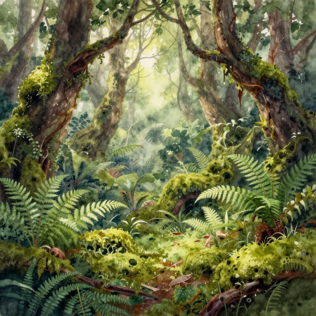 This image showcases a mystical, ancient forest rendered in a loose watercolor style. Lush ferns and moss cover the ground and trees, with ethereal light filtering through the canopy.