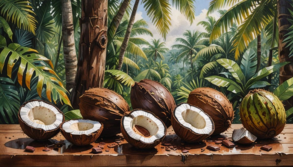 This inviting watercolor image features cacao pods and coconuts on a wooden table with tropical leaves. Rendered in a thick, impasto gouache style with textured layers on canvas.