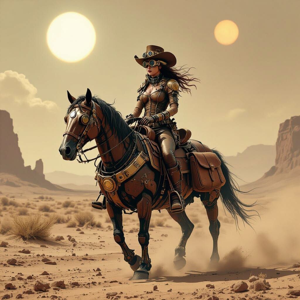 A lone cowgirl with steampunk goggles and chaps rides a clockwork horse through a dusty wasteland under twin suns. The scene features gritty, dystopian art with sharp shadows and cinematic lighting.