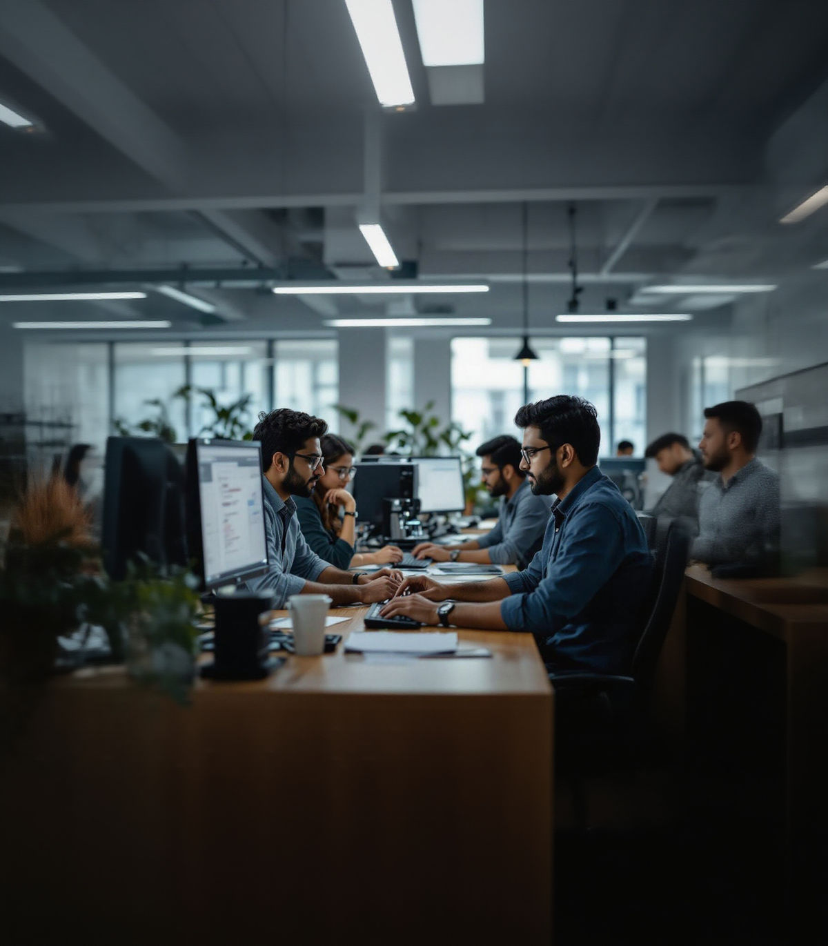 This image shows a modern office interior with software engineers at work. The scene is rendered in a cinematic style, with film grain and atmospheric lighting to enhance the drama.