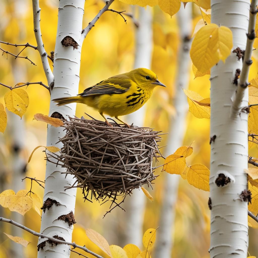 This image depicts a yellow warbler bird perched near its nest within a grove of golden-leaved aspen trees during autumn. The scene is rendered in warm, vivid colors.