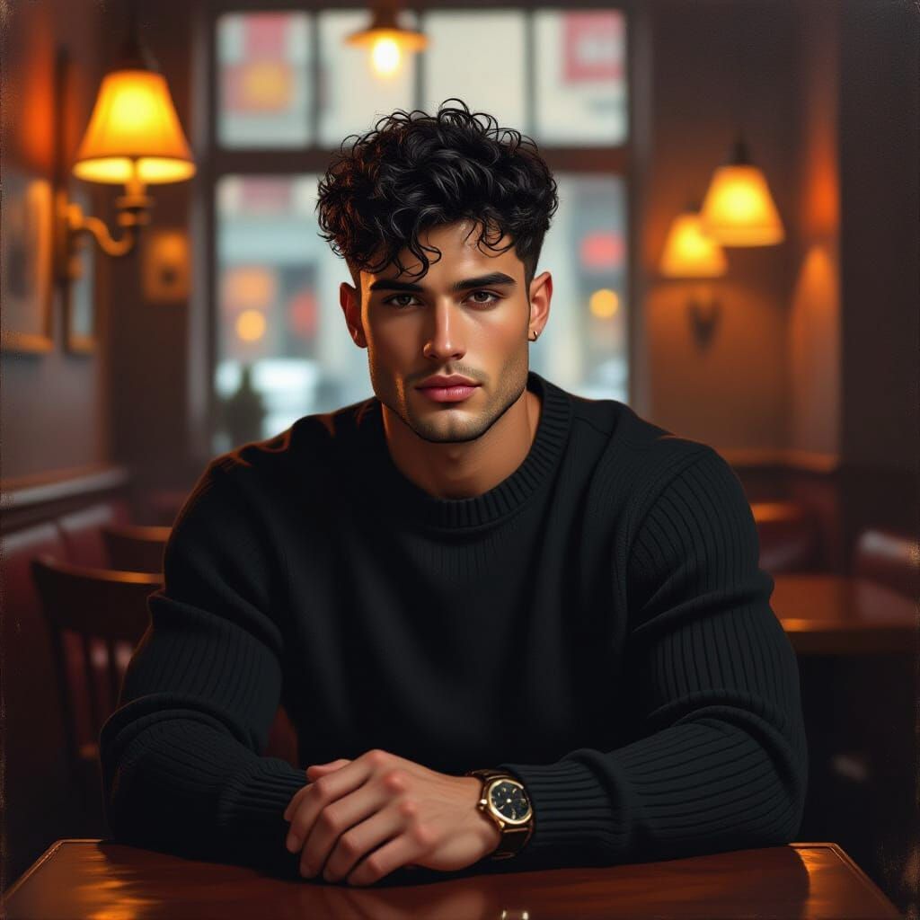 This image captures a young, muscular man with a grunge style in a dimly lit cafe. Rendered as a textured oil painting with warm light and deep shadows, it conveys youthful contemplation.