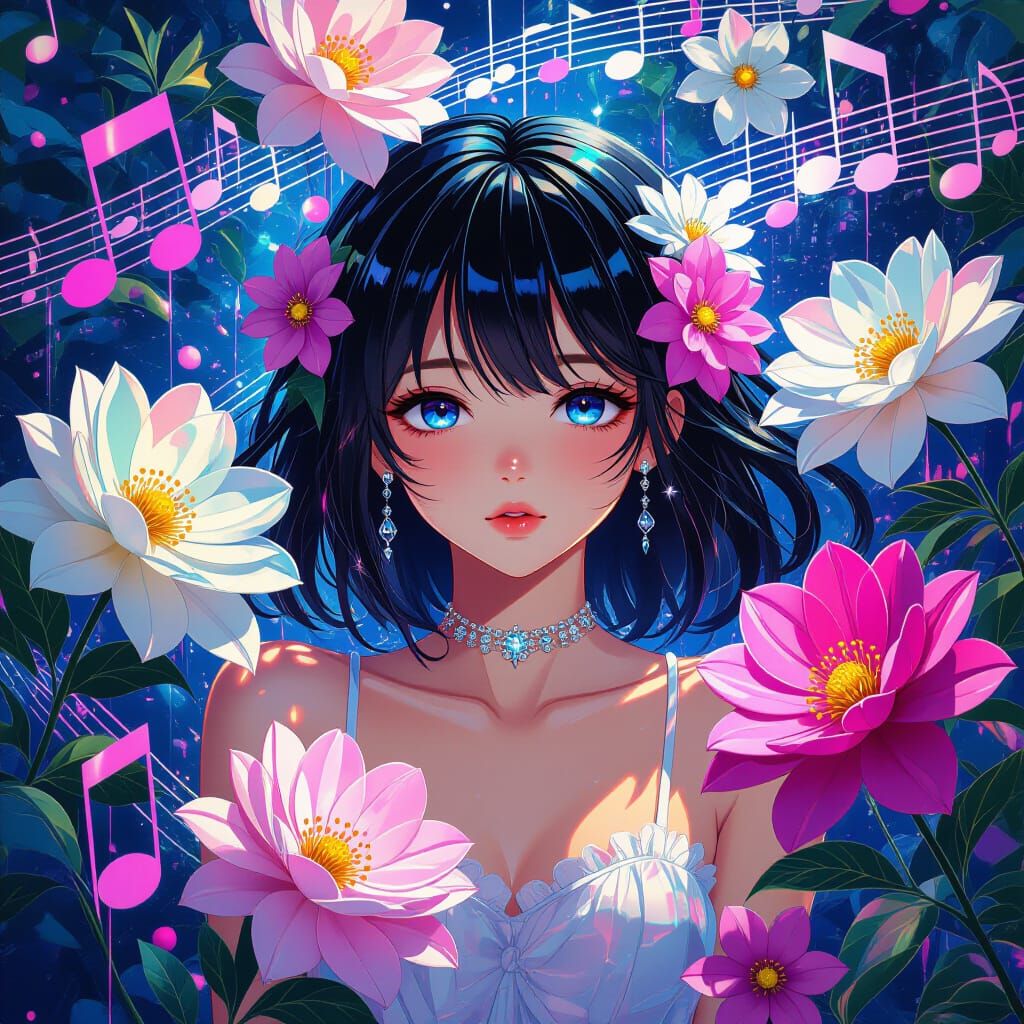 A vibrant image of an anime girl amidst colorful flowers and music notes. The artwork features shiny, melting elements in a glitchcore aesthetic, creating a surreal and dreamlike atmosphere.