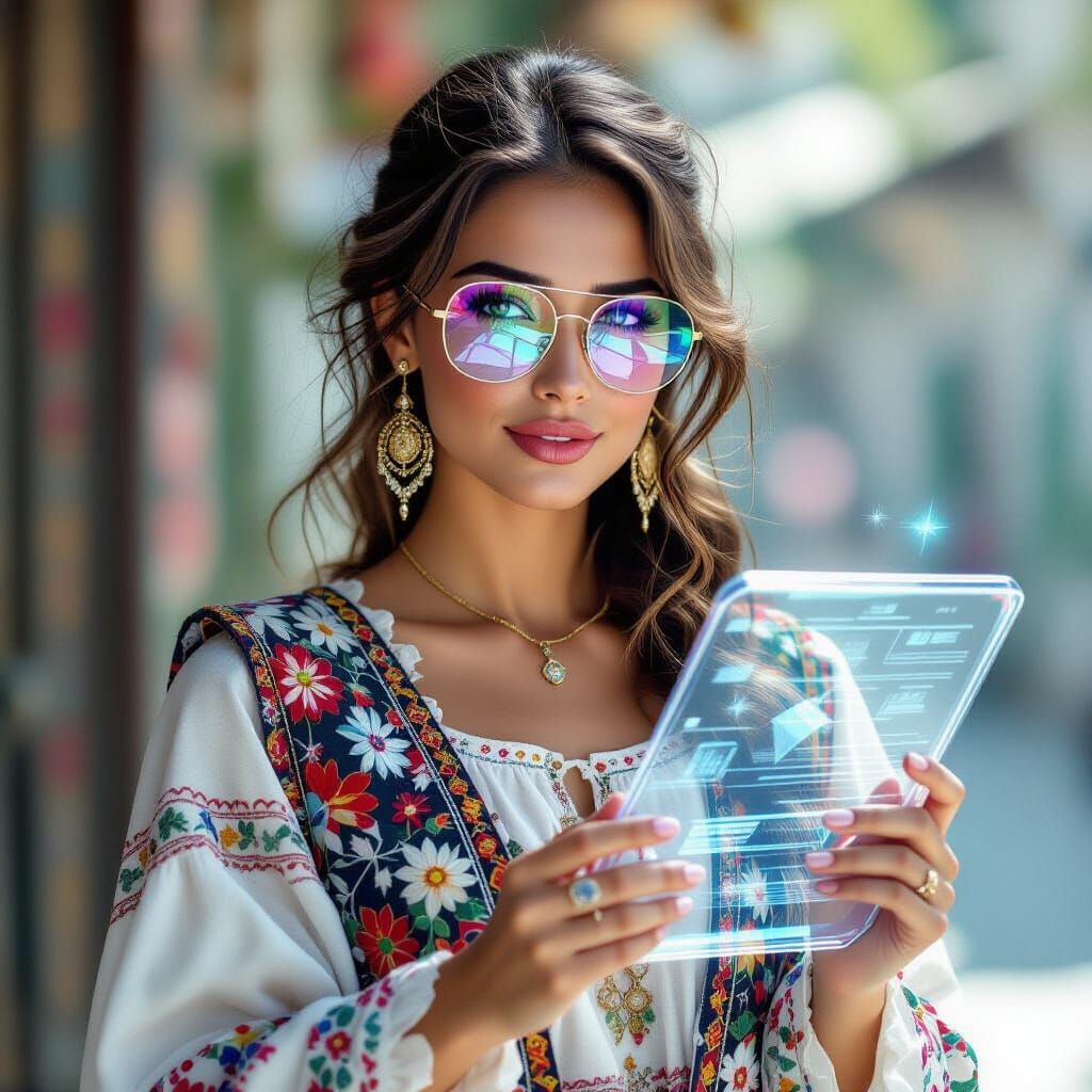 This image depicts an Albanian woman AI minister wearing a traditional embroidered vest and modern futuristic glasses, holding a holographic tablet. Created as detailed digital art with soft lighting.