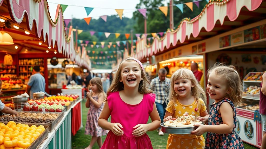 This image shows a lively county fair in a green landscape. Stalls offer food and crafts as happy children play. The scene is brightly lit with a bokeh effect, resembling professional DSLR photography.