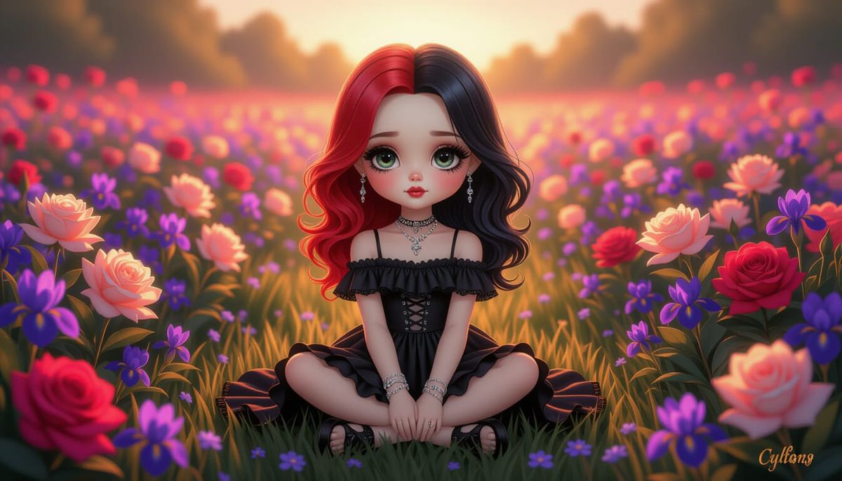 This image shows a Precious Moments Gothling character with split hair, seated in a luminous field of vibrant flowers. Rendered in a detailed, dream-like fantasy art style with golden hour lighting.