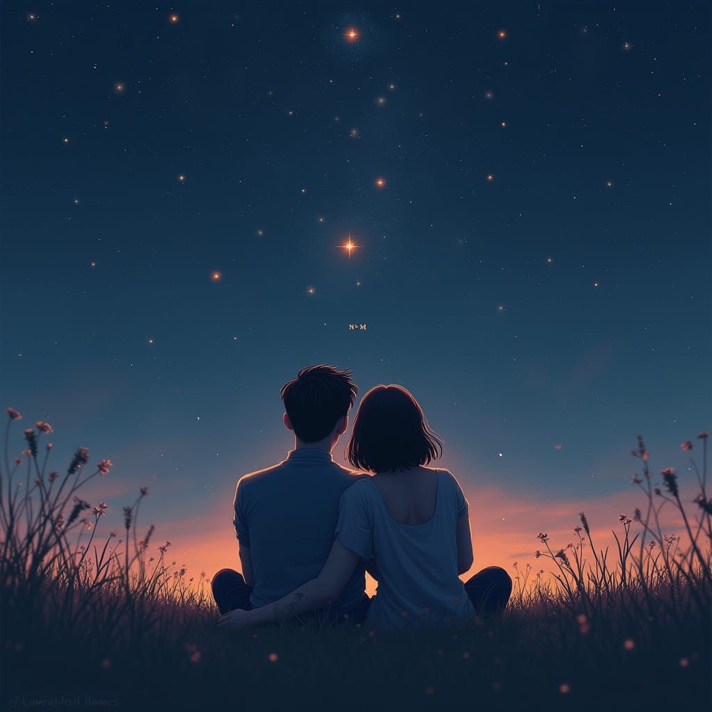 This image shows a couple embracing under a starry sky. Gentle text is subtly integrated into the romantic scene, rendered with soft, ethereal lighting, in a dreamy art nouveau style.