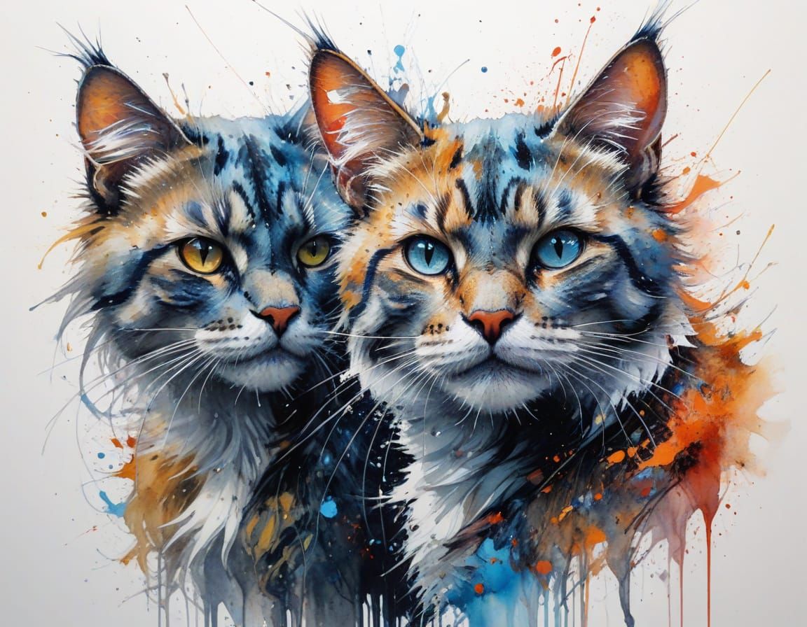 This image showcases killer cats in a vibrant, cinematic scene with expressive brushstrokes and soft focus, reminiscent of fine art watercolour techniques