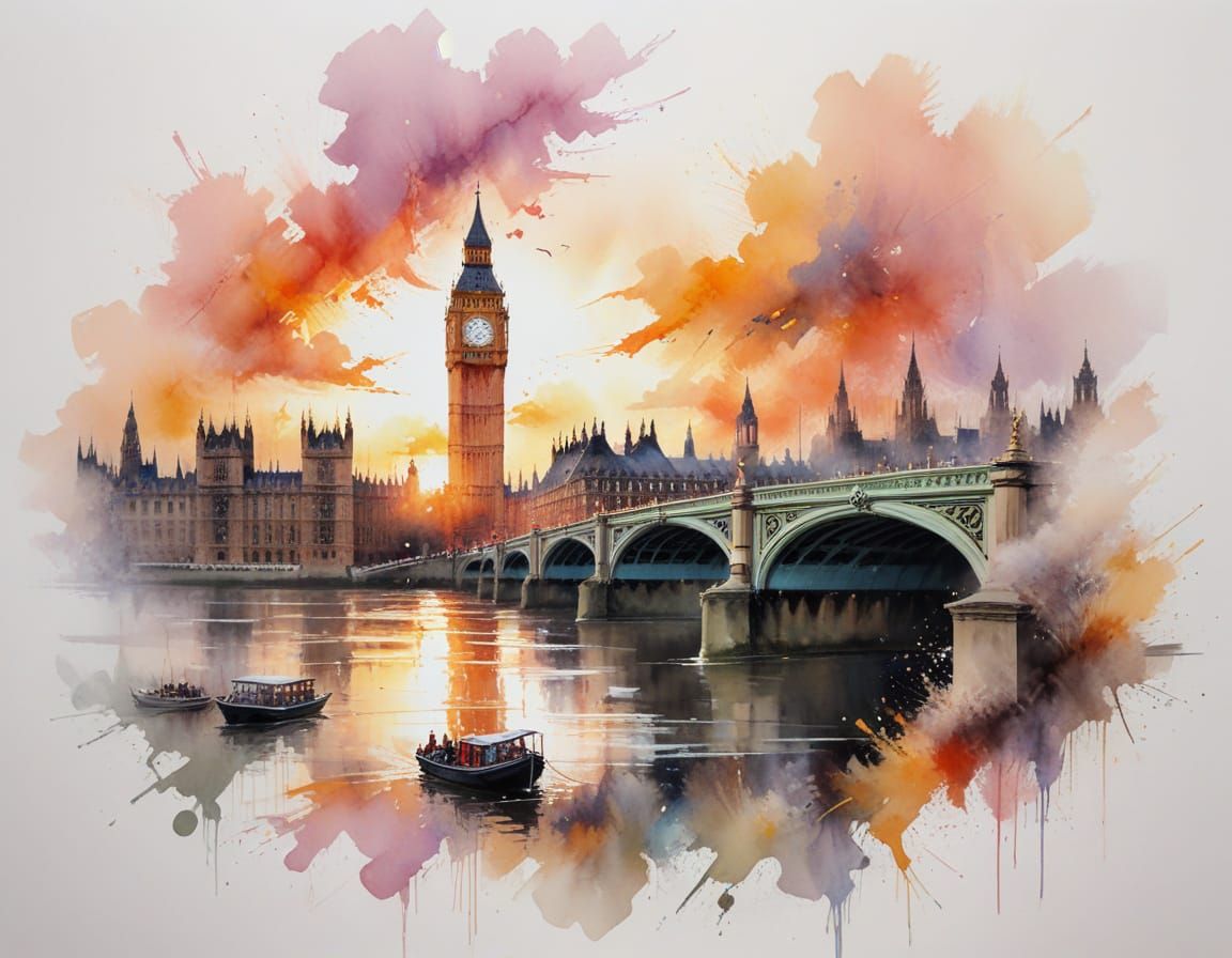 A watercolour painting capturing Big Ben and the Houses of Parliament at sunset, with pastel clouds over the Thames. Features delicate washes and expressive detail.