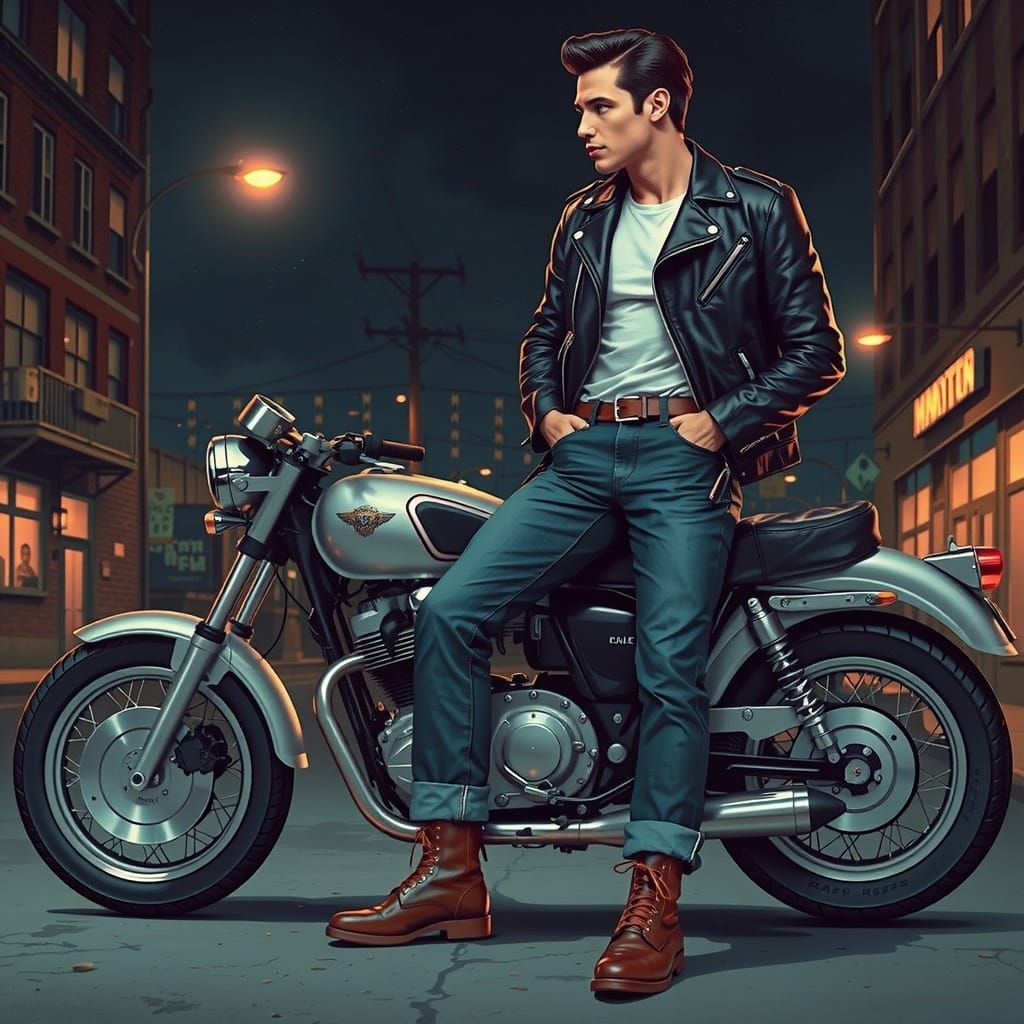 A young man in 1950s motorcycle fashion poses under streetlights. The image features cinematic lighting and a vibrant color palette with elegant lines and dynamic energy.