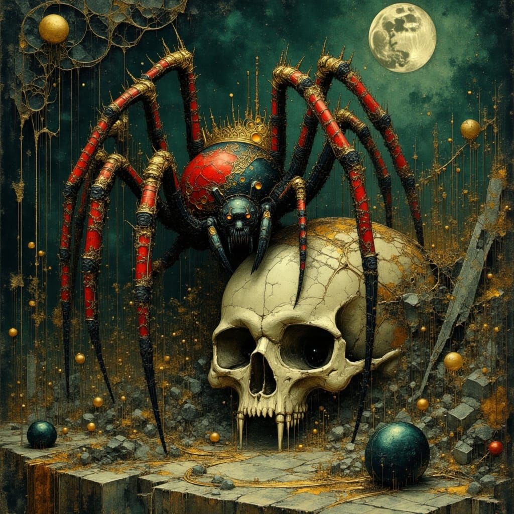 A striking image of a regal spider queen beside a detailed black and red spider on a skull, amidst fossilized remains and smaller spiders, illuminated by an eerie emerald and lunar glow with dramatic lighting.