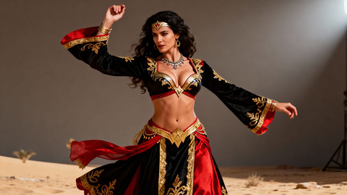 A hyper-realistic portrait of Wonder Woman as a vintage belly dancer in a detailed black, red, and gold costume. Professional studio lighting and sharp focus create a dramatic effect.